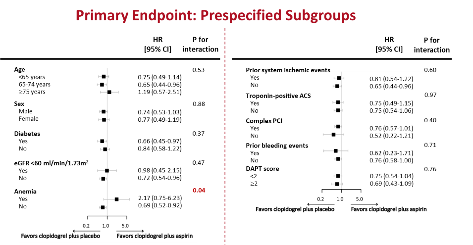 其他次要终点结果:氯吡格雷单药组的BARC 1、2、3或5型出血的发生风险显著低于氯吡格雷+阿司匹林组[14.5% vs. 18.1%,HR 0.78(95%CI:0.70-0.88),P<0.0001],其他次要终点两组无显著差异。