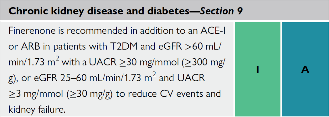 在指南第九章的“慢性肾病和糖尿病”管理中,同样详细描述了非奈利酮FIDELIO、FIGARO、FIDELITY的研究结果(详见下文非奈利酮循证回顾)。