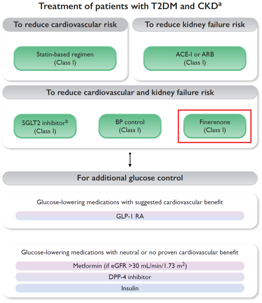 指南的“T2D患者心血管疾病管理”核心流程图和“T2D合并CKD患者降低心肾风险药物治疗”流程图中,均标注了非奈利酮的Ⅰ类用药地位(图3、图4)。非奈利酮可为患者带来心血管和肾脏的双重获益,且获益独立于降压及降糖治疗。