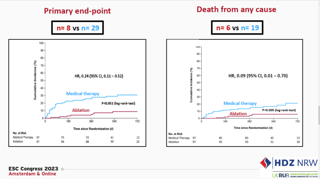 研究共入选194名患者,导管消融组和药物治疗组均为97例。结果显示,在接近3年的随访期内,导管消融组发生8例主要终点事件,药物治疗组发生29例主要终点事件,导管消融组主要终点事件发生率显著低于药物治疗组(8.2% vs 29.9%,HR 0.24, 95%CI 0.11-0.52);导管消融组发生6例全因死亡,药物治疗组发生19例全因死亡,导管消融组全因死亡发生率显著低于药物治疗组(6.2% vs 19.6%,HR 0.09, 95%CI 0.01-0.70)(图2)。
