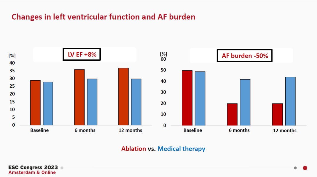 随访12个月时,导管消融组左心室射血分数较药物治疗组升高8%;导管消融组房颤负荷较药物治疗组降低50%。