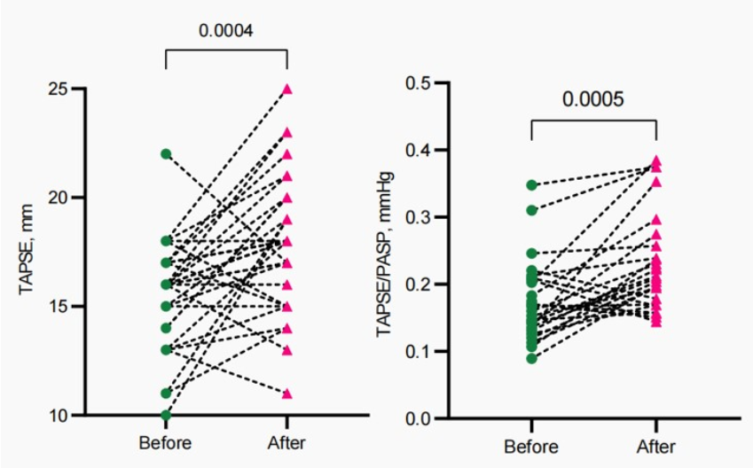 图1. 基线和随访中患者TAPSE及无创右心室-肺动脉耦合参数(TAPSE/PASP)的变化