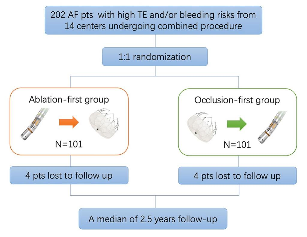 前期单中心研究发现,在以塞式封堵器(Watchman2.5)为封堵装置的一站式手术中,采用先封堵或先消融的策略,两者在近一年随访时的完全封堵率及房颤消融成功率方面差异并不显著,但先封堵组的新发残余漏发生率显著低于先消融组。这可能与先消融时引起左肺静脉与左心耳嵴部的水肿有关,对于先消融组的病例,即便按照大一号规格的原则进行封堵器选型,依然有可能出现因为急性期局部组织水肿消退而产生的新发残余漏。但该经验是否会得到广泛认可、不同联合策略是否会影响远期临床结局,彼时尚不得而知。于是宁波大学附属第一医院储慧民教授团队联合国内其他13家房颤中心,于2020年进行了COMBINATION研究的注册(研究号ChiCTR2000031486),并于2020年7月开始首例患者入组。