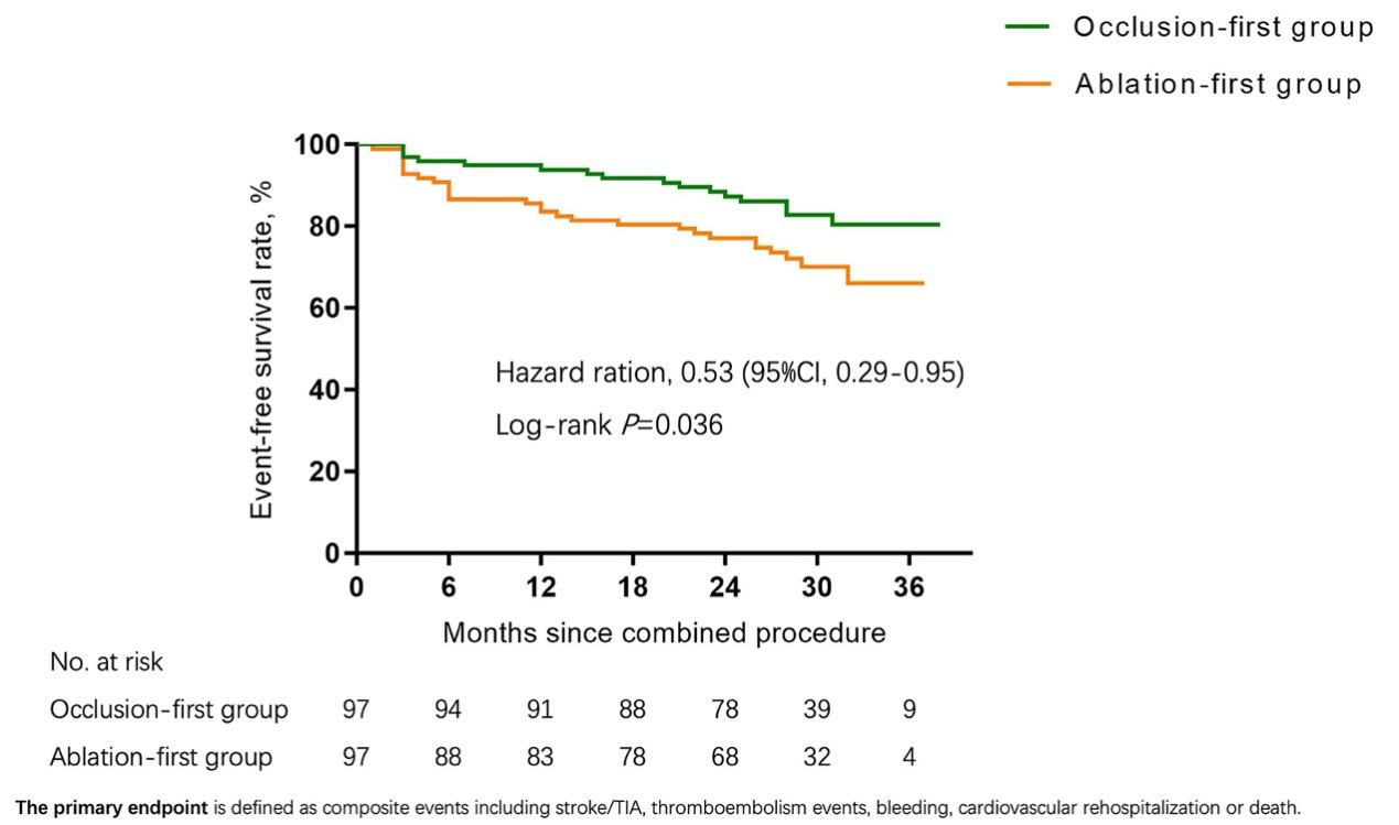 该研究共入组202例接受房颤一站式手术的患者(中位CHA2DS2-VASc评分4分,中位HAS-BLED评分2~3分),按1:1的比例随机分入先封堵组或先消融组,所有患者均采用Watchman2.5作为植入器械(图1)。先消融组患者既往脑出血比例更高,其余基线资料两组间未见显著差异。术中先封堵组测得的左心耳最大口径更宽,而先消融组有92.8%的患者均观察到了明显的嵴部水肿。所有患者均成功植入封堵器,其中一例患者因特殊心耳解剖结构植入双封堵器,植入封堵器尺寸集中在27 mm及30 mm两种规格。两组的手术时间、消融时间、封堵时间及X线剂量暴露相似,围术期手术相关并发症发生率也未见差异。经过中位2.5年的长期随访,两组均各有97例纳入分析(图1)。结果发现,两组均可显著降低卒中及出血风险,但先封堵组的无主要终点(定义为卒中/TIA、血栓栓塞、临床意义重要出血、心血管再住院或死亡的复合终点)生存率显著高于先消融组(83.5% vs 71.1%, log-rank P=0.036),先封堵策略可降低主要终点风险47%(图2)。此外,在心律失常复发率方面,虽然两组在1年随访时房颤及快速房性心律失常(ATA)的发生率未见差异,但长期随访中,先封堵组的房颤(HR 0.58, log-rank P=0.039)及ATA(HR 0.62, log-rank P=0.044)复发率均更低。亚组分析提示,男性及CHA2DS2-VASc评分≥3分是减少主要终点发生风险的保护因素。