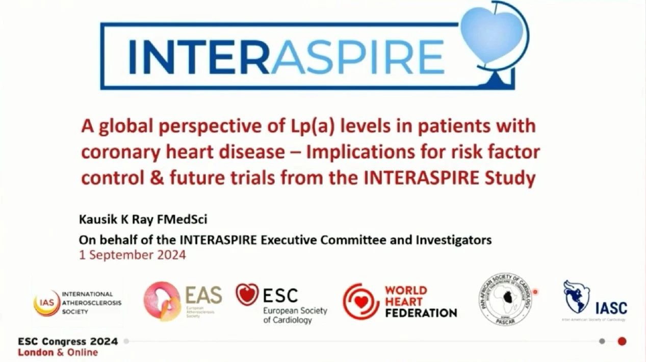 2024年9月1日,来自帝国理工学院的Kausik K Ray教授在2024年欧洲心脏病学会年会(ESC 2024)Late-Breaking Science专场中,现场公布了INTERASPIRE研究结果(该项研究结果同步发表于Eur Heart J[3]),并就INTERASPIRE研究中Lp(a)相关的亚组分析结果做了汇报。