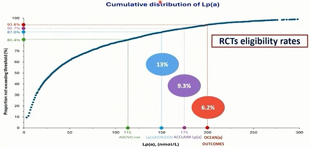 图1. INTERASPIRE研究中患者Lp(a)水平的分布以及达到不同临床研究界值的比例