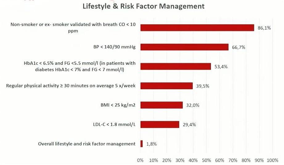 在Lp(a)升高的患者中,心血管危险因素控制情况如何?通过对INTERASPIRE研究中Lp(a)≥115 nmol/L患者的危险因素控制情况进行统计分析,发现达到6条危险因素(包括吸烟、血压、血糖、运动、体重和低密度脂蛋白)均控制达标的患者占比仅为1.8%(图5)。
