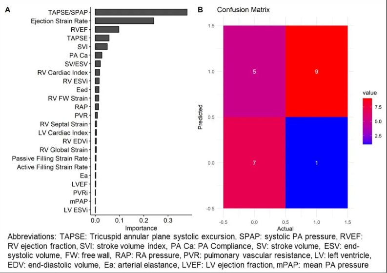 一项研究提示,基于无监督机器学习定义的严重PAH的超声心动图表型可预测预后,使传统影像学迈向精准化医疗(图1)[2]。另一项采用极端梯度提升(XGBoost)来识别与PH死亡率相关的血流动力学和影像学变量的研究证明,XGBoost模型具有较高的训练准确性和特异性[3](图2)。优化此模型对PH的风险分层和临床决策制定有益。