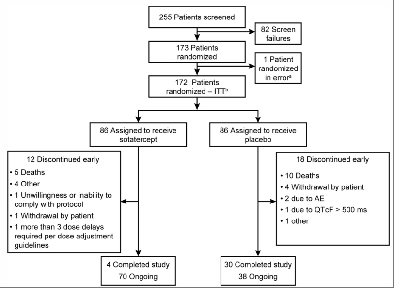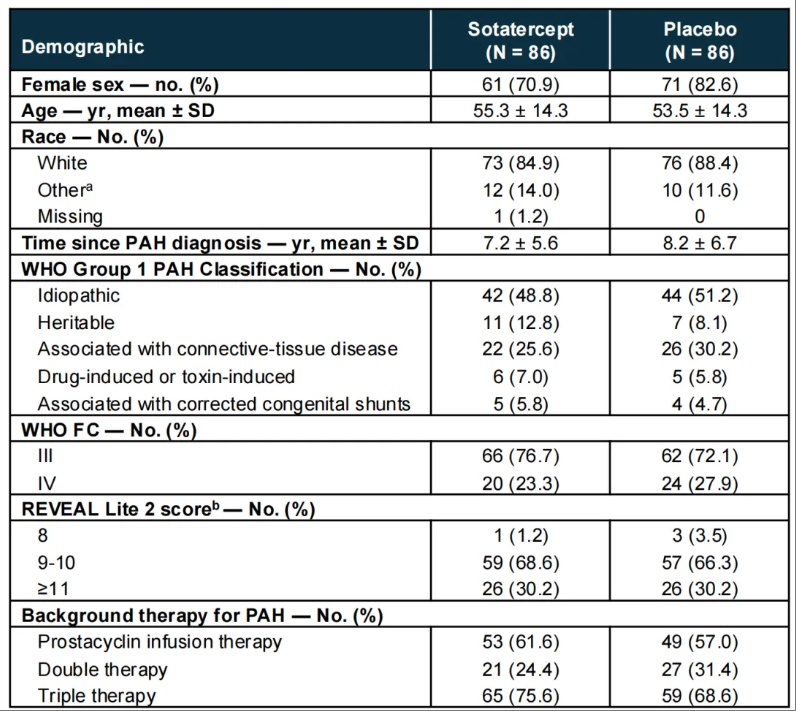 该试验招募了172名接受最大耐受背景PAH治疗的参与者,以1∶1的比例分为 Sotatercept治疗组和安慰剂组(图5)。研究基线人群中,102例患者(59.3%)接受前列环素输注治疗;48名患者(27.9%)接受双联治疗;124名患者(72.1%)接受三联疗法。Sotatercept组和安慰剂组之间的人口统计学和基线特征相似(图6)。