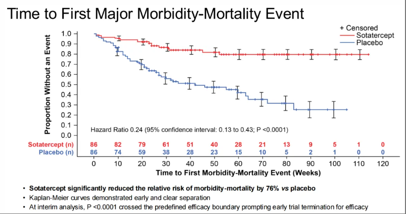 研究结果显示,尽管接受了最大程度的背景治疗,但与安慰剂组相比,Sotatercept组显著降低复合终点(全因死亡、肺移植或因疾病恶化住院≥24小时)风险达76%。中期分析显示,Sotatercept组和安慰剂组的生存曲线(KM曲线)显示出早期且明显的差异(P<0.0001),达到了预先设定的疗效界值(图7)。